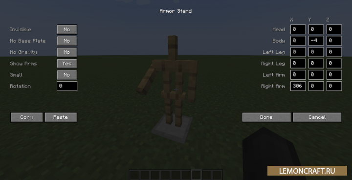Мод на настраиваемую стойку для брони Armor Poser добавит в игру возможность установки стойки для брони, которую вы сможете настроить под себя. Вы сможете изменять размеры брони, убрать плиту, добавить или убрать руку и другое. Для включения режима настройки используйте комбинацию клавиш Shift+ПКМ в тот момент, когда вы на нее смотрите.